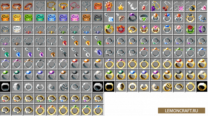 Мод на аксессуары для мода baubles Behgameon является большим для модов baubles (1.12.2) и curios (1.14.4), который добавляет в игру более ста аксессуаров, которые можно использовать в данных модах. Данный аксессуары можно найти по всему миру, они спрятаны в сундуках. Все добавленные предметы можно использовать только в декоративных целях, но если установить мод Mine and Slash, то эти предметы к нему подключатся.