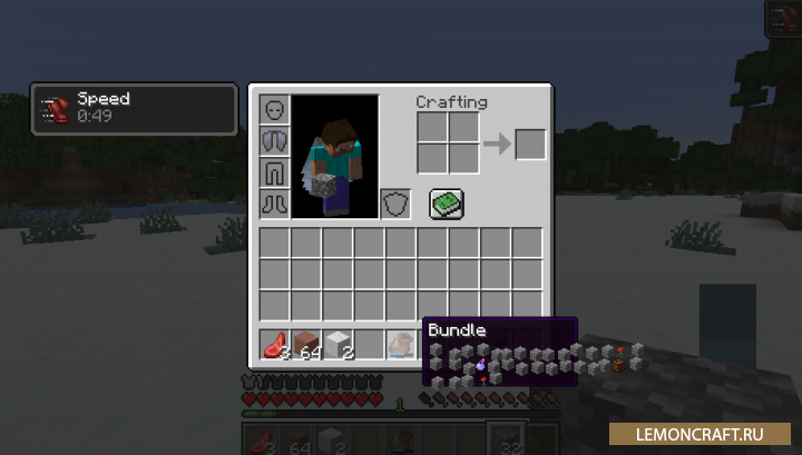 Мод на вместительный мешок Bundles! добавляет в игру новый мешок, в который вы сможете засунуть до 64 предметов сразу. Но следует учесть, что в данном мешке может храниться не более половины стака одинаковых предметов.